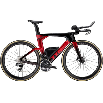The Speed Concept SLR 9 AXS is an aerodynamic carbon triathlon bike engineered for incredible speed and seamless integration. Every bit of this bike “ from the light aero frame to ride-smoothing IsoSpeed to cutting-edge fuel and hydration systems “ has been painstakingly designed to help you beat your PR again, and again, and again. It comes equipped with cream-of-the-crop components for your best performance yet, including top-tier SRAM RED wireless shifting. You leave it all on the course and want a tri bike that does the same. You want blazing-fast aero speed, SRAM RED wireless electronic drivetrain for precise shifts and loads of integrated accessories that make hydrating and re-fuelling easy. Ultra-lightweight 800 Series OCLV Carbon frame, drag-reducing Kammtail Virtual Foil (KVF) tube shaping, Speed Concept full foil carbon fork, road-smoothing IsoSpeed, integrated fuel storage, hydration and flat kit storage, SRAM RED AXS wireless electronic 12-speed drivetrain with SRAM AXS Blips shifters, a RED AXS power meter, fully integrated handlebar and stem, Bontrager Hilo Pro Carbon triathlon-specific saddle for an aggressive aero position, disc brakes for reliable stopping power and aero Bontrager Aeolus RSL 51 OCLV Carbon wheels. The Speed Concept is as fast as it is smart. Its simple, thoughtful design and integrated features ensure a less stressful race day, help you achieve your fastest bike splits ever and set you up for a successful run. The SLR 9 also gives you the performance boost of SRAM's RED AXS wireless electronic drivetrain and high-end Bontrager OCLV Carbon wheels.